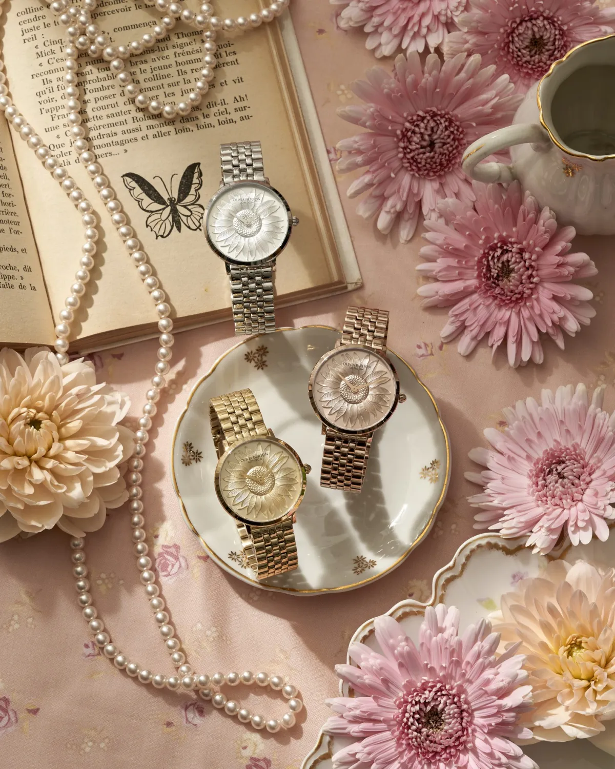 新作の最大の特徴は、ひと回り大きくなった35mmのケースサイズです。このサイズにすることで、立体的な花びらのディテールがより際立ち、手元に存在感を与えています。洗練されたデザインでは、文字盤と同系色のメタルブレスレットが統一感を生み出し、上品な仕上がりを実現しています。