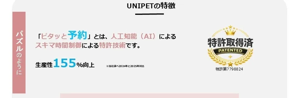 このシステムでは、予約の入り方によって発生する空き時間をリアルタイムで解析し、最適な予約枠へと調整します。これは特許技術に基づいており、業界内でも独自性が際立っています。