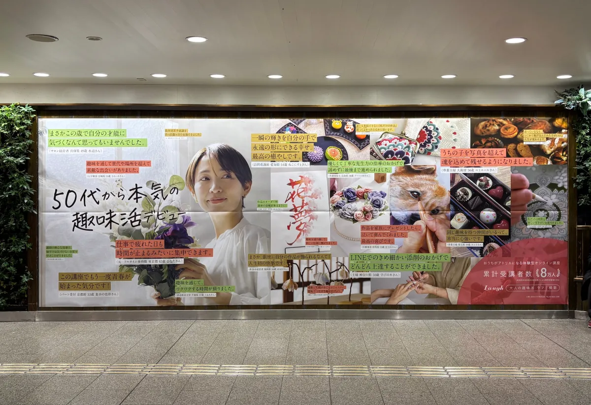 2009年の創業以来、ラフ株式会社は「学びと趣味で、生きがいをデザインする」という理念のもとで講座を構築してきました。オンライン事業を本格化した2021年からは、理念に共感する講師との信頼関係を築くことに力を注ぎ、講座の質を向上させてきました。今回の阪急梅田駅での初広告掲出は、その取り組みをさらに広める重要なステップです。多くの人が行き交う駅での広告が、新たな学びへの関心を引き起こし、自分らしい学びの探求を促すことが期待されます。