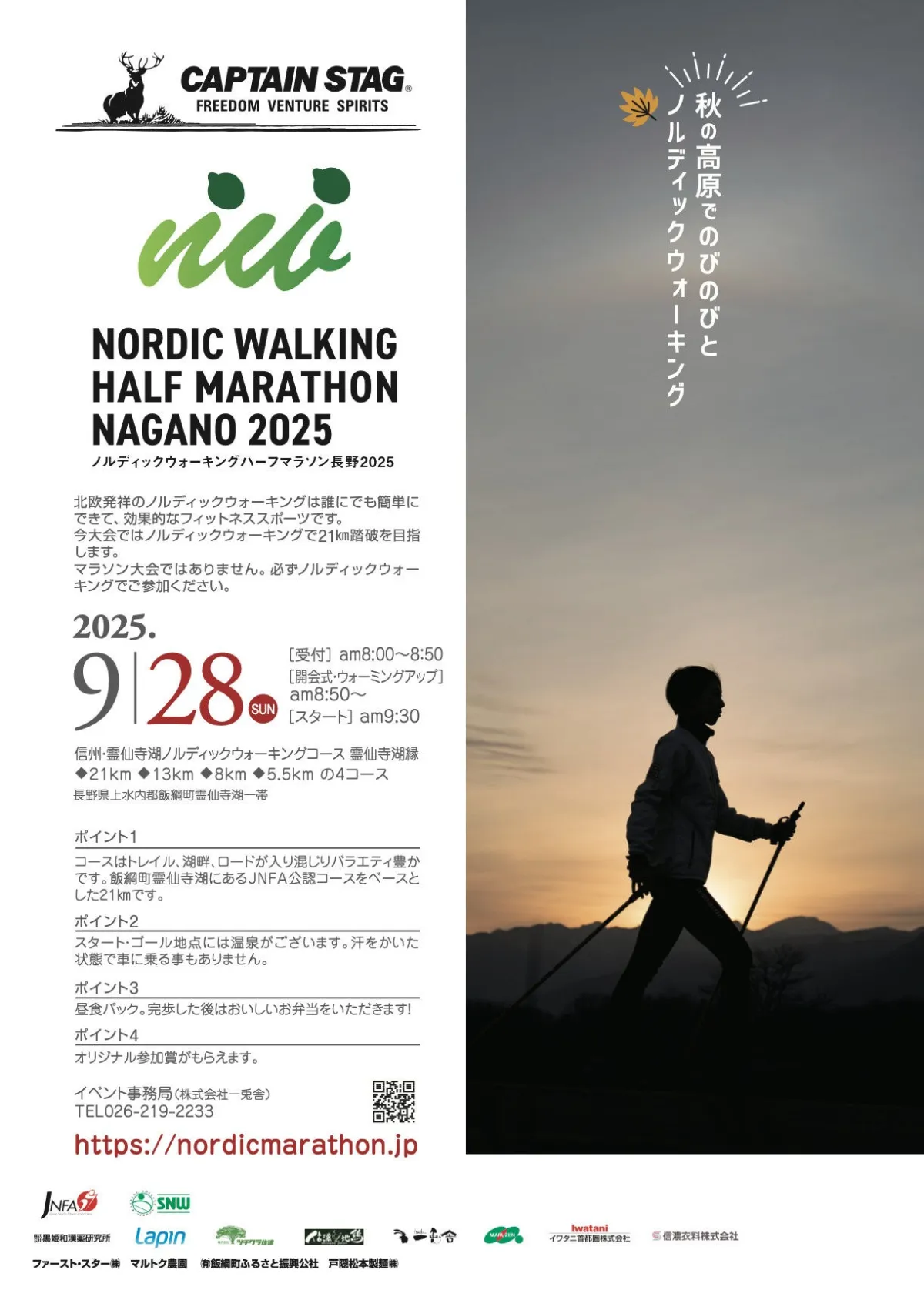 2025年9月28日(日)に長野県飯綱町で、「ノルディックウォーキングハーフマラソン長野2025」が開催されます。このイベントは、NPO法人日本ノルディックフィットネス協会(JNFA)から公認された初のノルディックウォーキングコースを舞台にし、幅広い参加者を受け入れる魅力的な大会です。