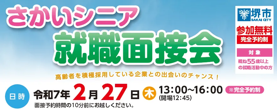 - - さかいシニア就職面接会: 令和7年2月3日(月)から申込開始(先着順)。最寄りのハローワークにて事前に申し込み、紹介状を受け取ってください。問い合わせはハローワーク堺へ(072-238-8301、部門コード41#)。
