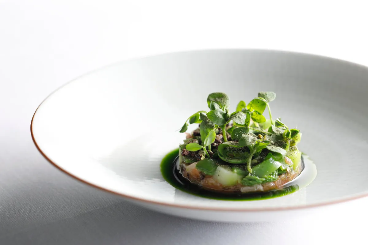 山女魚 塩蔵山菜のタルタルです。これは、塩漬けの山女魚と、地元で採れた山菜を使ったタルタルで、里山文化の表現として非常に魅力的。シェフは新潟出身で、幼少期から家族に受け継がれた貯蔵文化を大切にし、それを未来へとつなげたいという想いが込められています。
