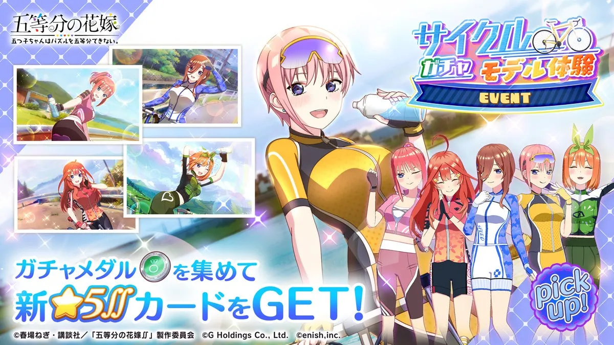 アニメ「五等分の花嫁」を元にしたゲームアプリ『五等分の花嫁 五つ子ちゃんはパズルを五等分できない。』が、待望の新イベント「五つ子ちゃんのサイクリング~突然のモデル撮影!?~」を開催します。このイベントは、2024年9月6日(金)から9月15日(日)までの期間限定で実施されます。