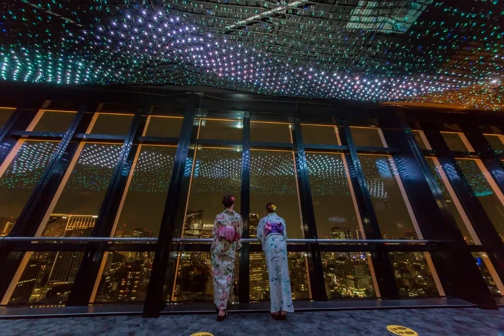このイルミネーションの魅力は、15分ごとに色が変わる「レインボーミルキーウェイ」というカラフルなショーだ。様々な色合いの光が流れ星に変わり、まるで本物の天の川が東京の空に現れたかのように感じさせてくれる。また、夜になると窓ガラスに反射する光が作り出すリアルな夜景とのコラボレーションも楽しめる。