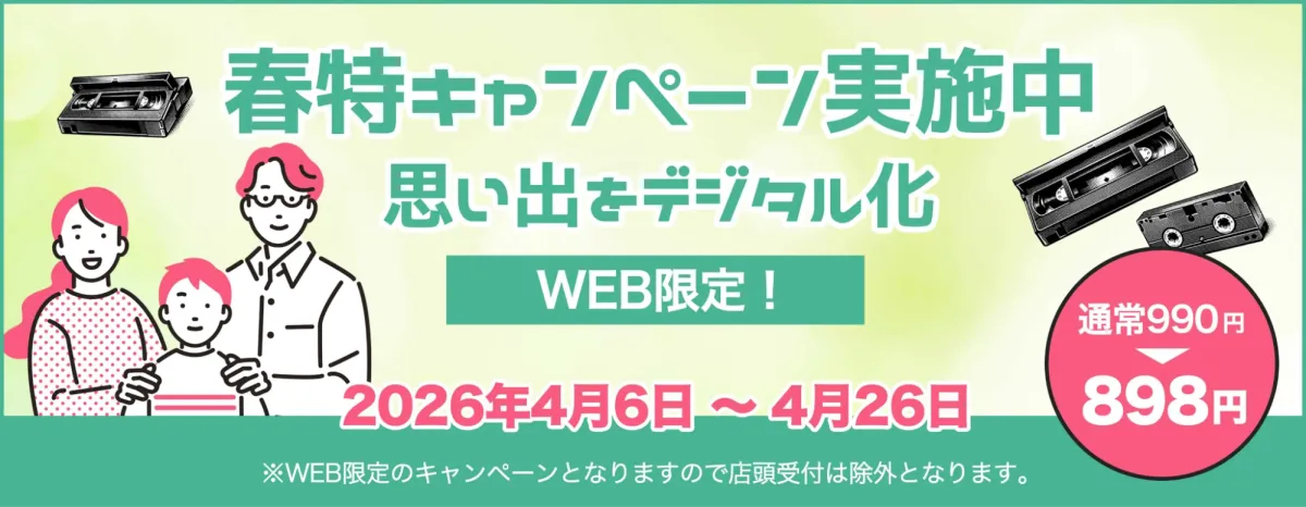 「春特キャンペーン」は、2026年4月6日から4月26日までの期間限定で、通常990円のダビング料金が898円になるWE限定のオファーです。新生活の季節に実家や自宅の整理が行われるこの時期に、大切な映像を気軽にデジタル化できる絶好のチャンスです。