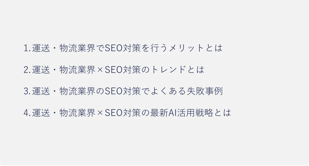 運送・物流業界でのSEO対策は、AIの力を借りることで、効率的かつ効果的に展開できます。業界に関わるすべての方にとって必見のレポートです。