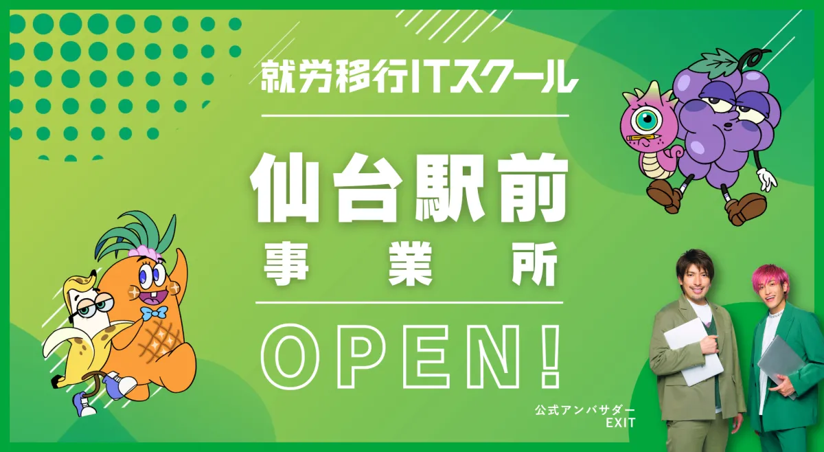 新拠点「就労移行ITスクール仙台駅前通り」は、仙台駅から徒歩8分の便利なロケーションにあり、プログラミングやWebデザインなど、時代に即したIT関連スキルを学ぶことができます。