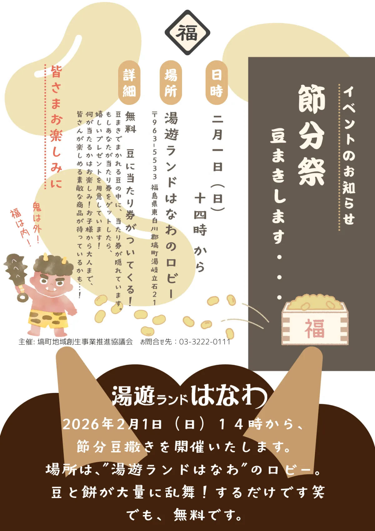 福島県東白川郡塙町にある温泉複合施設「湯遊ランドはなわ」で、2026年2月1日(日)に「豆まき@湯遊ランドはなわ」が開催されます。このイベントは、地域創生事業推進協議会が主催しており、昨年大好評だった豆まきを再度行うこととなりました。参加は事前予約が不要で、誰でも無料で楽しめるのが魅力です。ぜひ、お気軽にお立ち寄りください。