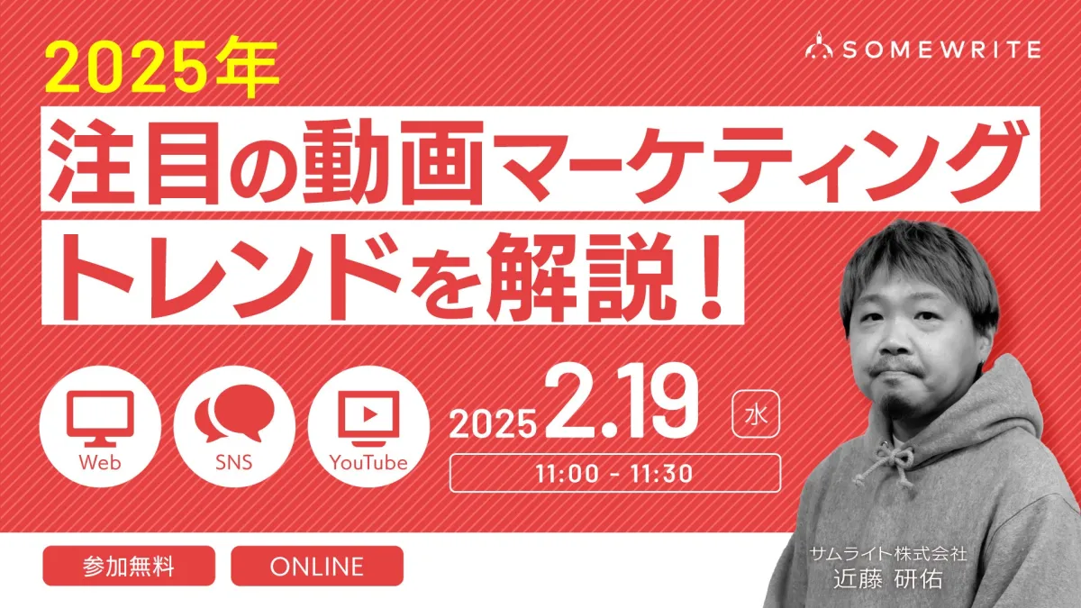 企業のコンテンツマーケティングやメディアビジネス支援に特化したサムライト株式会社が、2025年に必要となる動画マーケティングのトレンドを解説する無料オンラインセミナーを2月19日(水)11時から開催します。