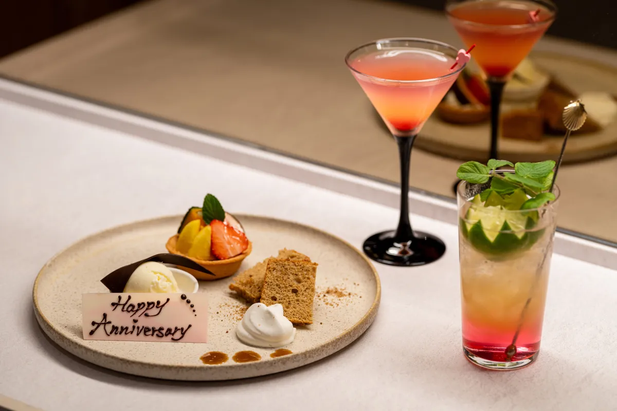 「星河」のパティシエールが心を込めて作るアニバーサリーデザートプレートも特別に提供されます。沖縄産の黒糖を使用したふんわりとした食感のシフォンケーキや、南国を感じさせるフルーツを用いたタルトが詰まった華やかな一皿が、新たな気持ちで周年を迎えるお手伝いをしてくれます。