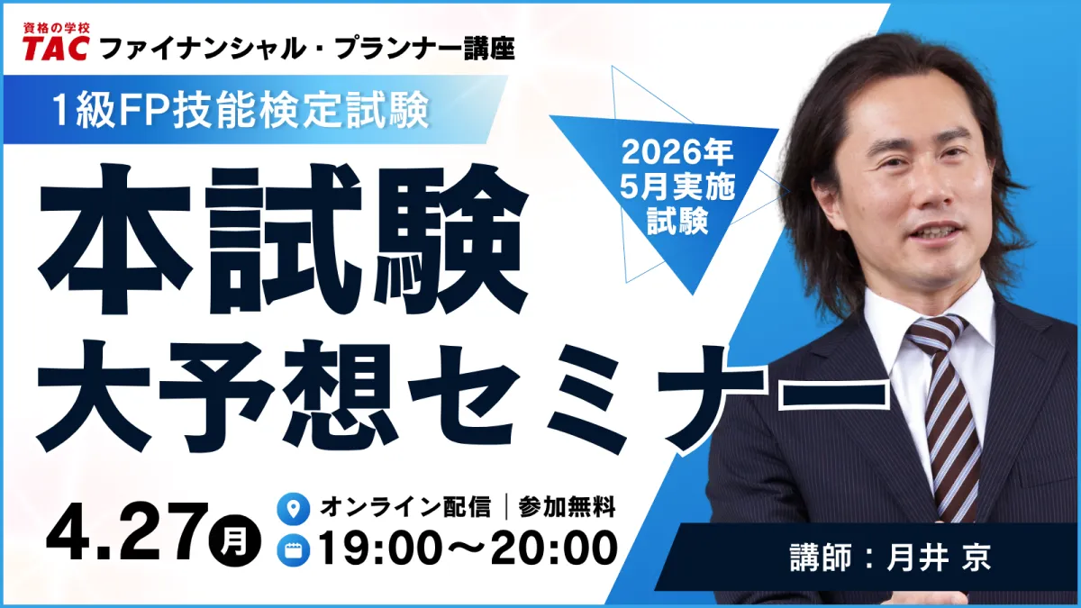 2026年5月に予定される1級ファイナンシャルプランナー(FP)試験に向けて、資格の学校TACが無料のオンラインセミナーを開催します。本セミナーは、TACの経験豊富な講師である月井京氏が担当し、受講生だけでなく誰でも参加できます。オンライン形式での実施なので、自宅から気軽に参加可能です。