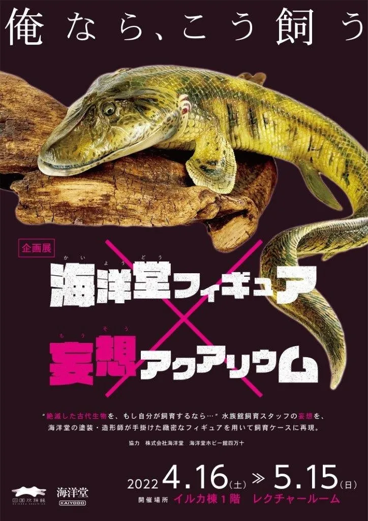 香川県の四国水族館では、国内フィギュアメーカーのパイオニアである海洋堂とのコラボレーション企画展「海洋堂フィギュア×妄想アクアリウム」が開催されました。本企画展では、水族館飼育スタッフが「絶滅した生物を、もし自分が飼育するなら…」という妄想を、海洋堂の精巧なフィギュアを用いて実現。知識と想像力で、現存しない生物を生き生きと再現した、まさに「妄想アクアリウム」の世界が広がっています。