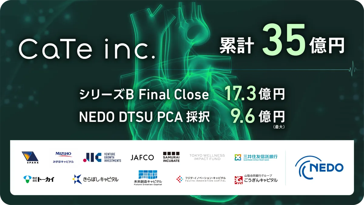 CaTeは、これまでに約35億円の資金を調達しており、NEDOのDTSU事業のSTSフェーズを終了後、PCAフェーズへ進みます。最新の支援では、最大9.6億円の補助金と、シリーズBでの出資17.3億円を活用し、心臓リハビリプログラムの臨床試験及び国際展開を強化する計画です。