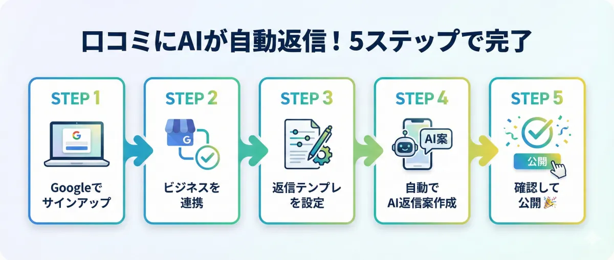「おもてなしレビューAI」の最大の魅力は、その直感的なワークフローです。サービスは、登録からレビュー返信までをわずか5ステップに簡素化しています。以下に、その主要な機能を紹介します。