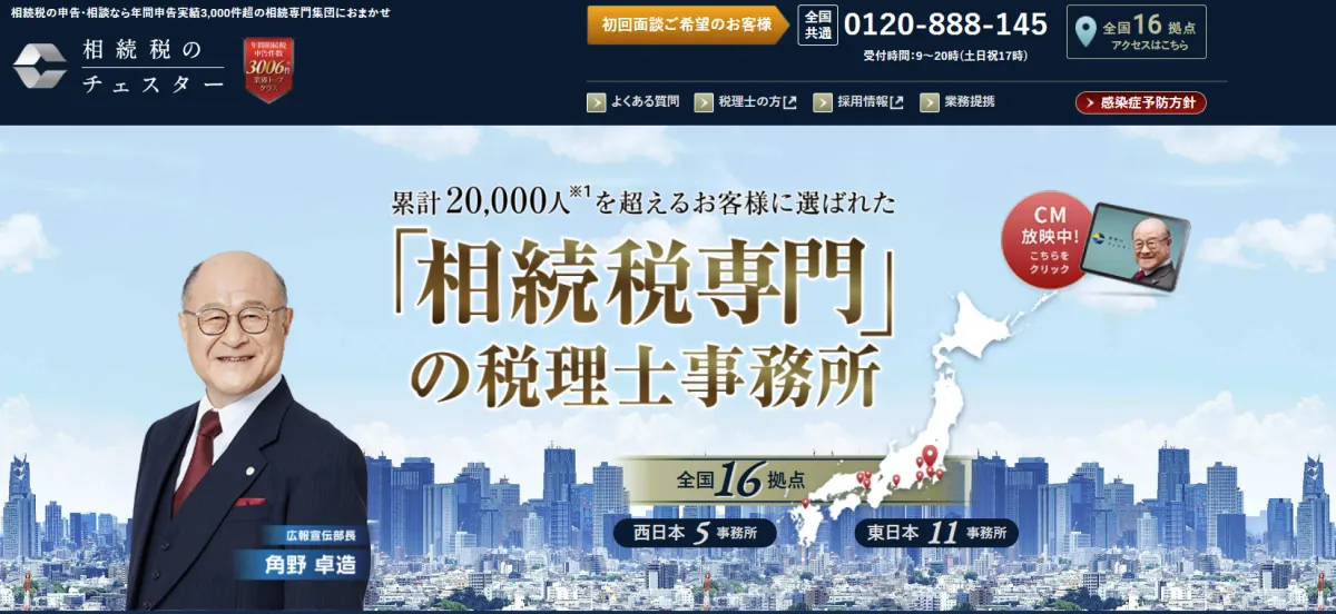 税理士法人チェスター(以下、チェスター)は、相続税を専門とする税理士法人であり、ファイナンシャルプランナーとして業界トップの地位を目指しています。創業以来、相続税申告の実績を積み重ね、年間3,000件以上の取扱を誇る国内最大級の事務所として知られており、全国に19の拠点を展開しています。