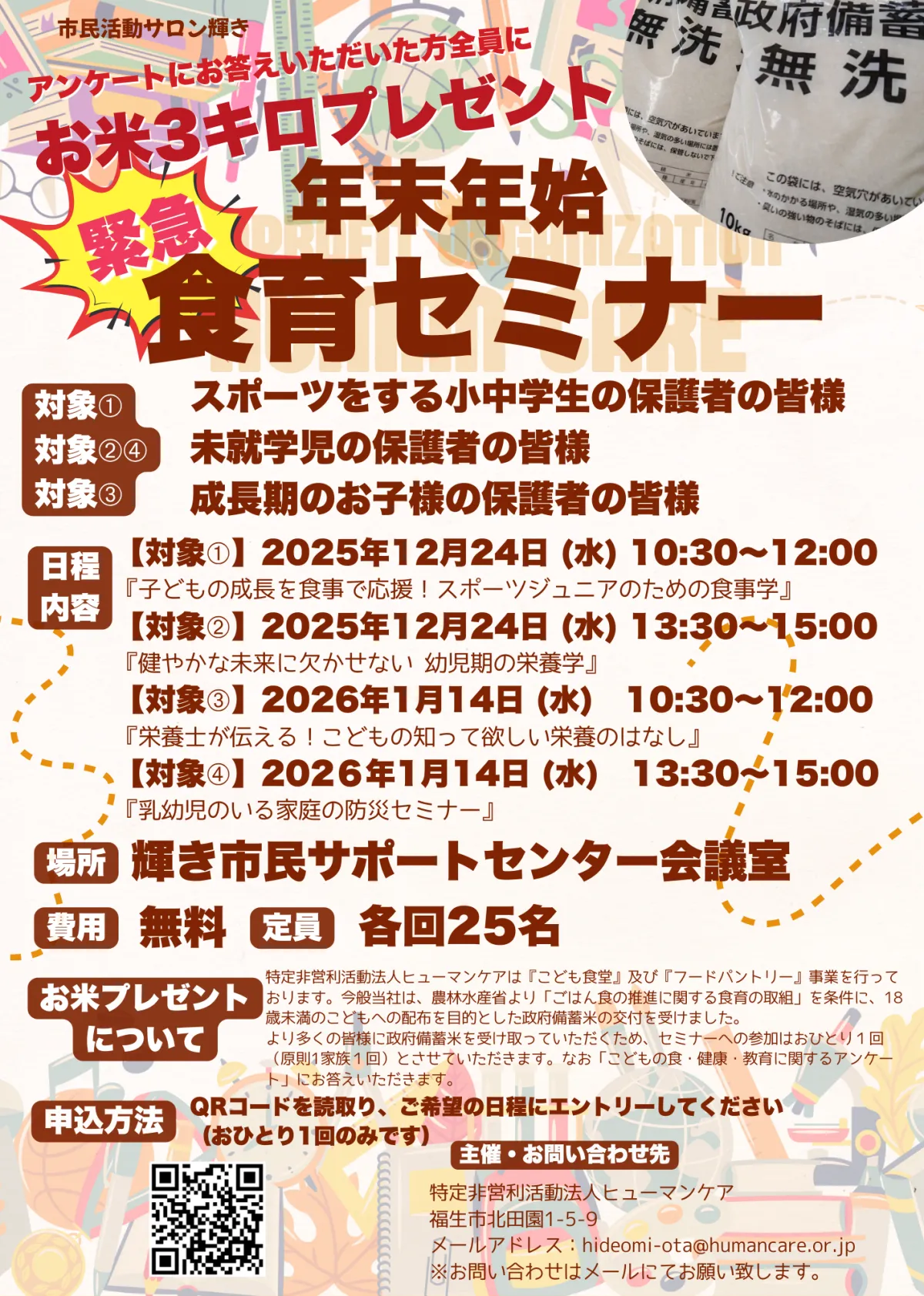 2025年の年末から2026年の年始にかけて、特定非営利活動法人ヒューマンケアが「緊急 食育セミナー」を実施します。このセミナーは、地域の子育て家庭を対象に、食育の重要性を伝えることを目的としています。セミナー参加者には、アンケートに回答すると政府備蓄米3kgを無償で配布する特典もあります。