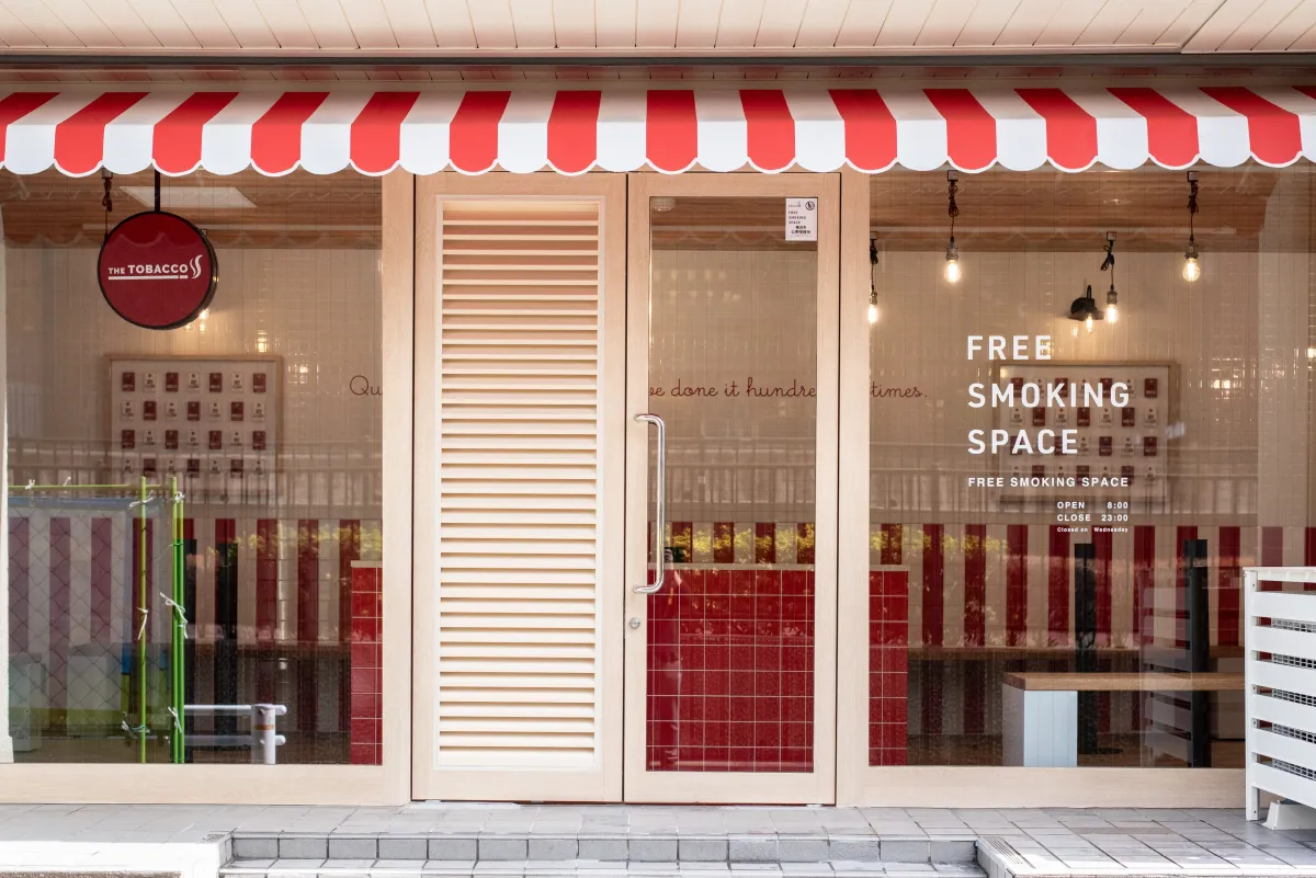 店舗の内装は「西洋のお菓子屋さん」をテーマにし、赤と白のストライプのファサードが視覚的に心地よさを感じさせます。また、木製の窓枠やタイルのデザインは温かみを演出し、フィラメントライトが日常にリラックスした空気を添えています。このようにして、喫煙所がそこにあるだけで街の一部となり、訪れる方々にとっての「ほっと一息つける場所」となれるようデザインされています。