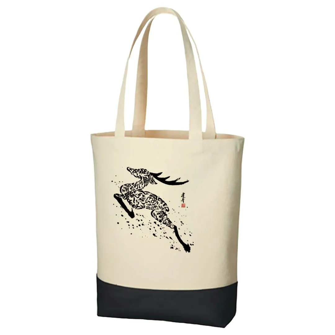 トートバッグは、墨絵で描かれた鹿のデザインが特徴です。落ち着いたバイカラーの配色は、墨絵の黒と調和し、シンプルでありながらおしゃれな印象を与えます。使用している素材はコットンキャンバスで、ラフで自然な風合いが魅力です。このバッグはA4サイズがしっかりと収まる実用性も兼ね備えており、通勤や通学、ショッピング、観光などさまざまなシーンでその力を発揮します。