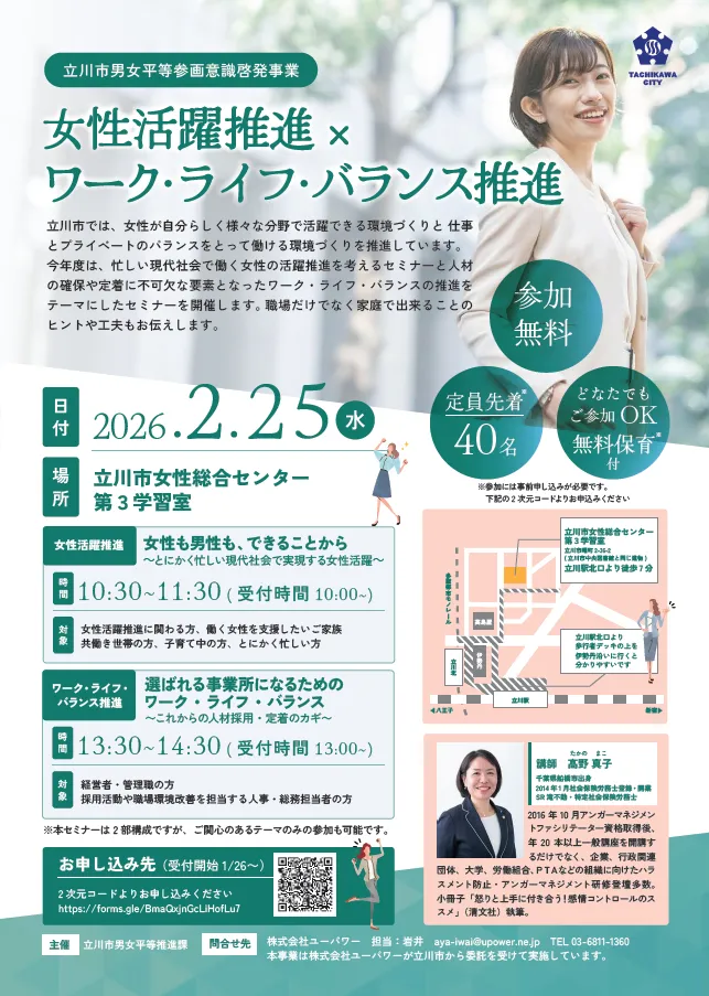 立川市の男女平等推進課が主催するセミナーが、令和8年2月25日(水曜日)に開催されます。このセミナーでは、職場における女性の活躍の重要性と、忙しい現代人が抱えるワーク・ライフ・バランスの課題について深く掘り下げていきます。
