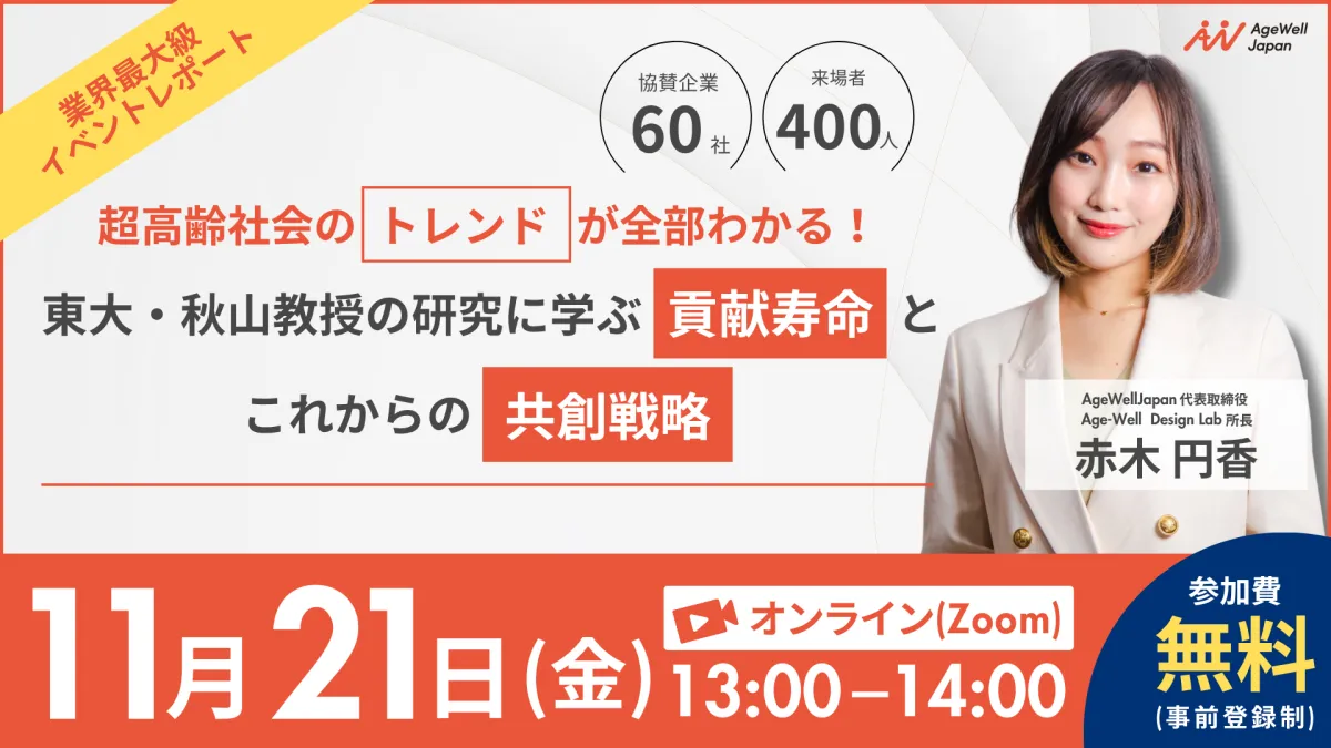 2025年11月21日(金)13:00から、オンラインで「超高齢社会のトレンドが全部わかる!東大・秋山教授の研究に学ぶ貢献寿命とこれからの共創戦略」というテーマの無料ウェビナーが開催されます。主催は、シニア向けのサービスを展開する株式会社AgeWellJapan。代表取締役社長の赤木円香氏が、その内容を一手に監修しています。