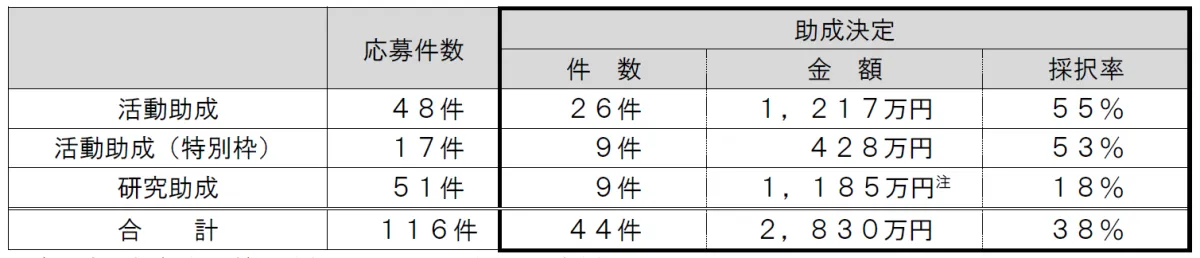 この助成金の応募は、昨年より増えており、活動助成には48件、特別枠を含む活動助成は17件、研究助成は51件という116件の応募がありました。審査は、当財団の事業審査評価委員会によって厳正に行われ、最終的に選ばれた44件が支援を受けることとなりました。