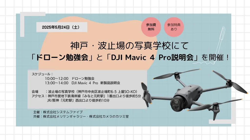 2025年5月24日(土)、神戸市中央区にある波止場の写真学校で「ドローン勉強会」と「DJI Mavic 4 Pro 説明会」が開催されます。このイベントは、ドローン初心者から最新情報を学びたい方まで、幅広い方に向けた内容になっています。