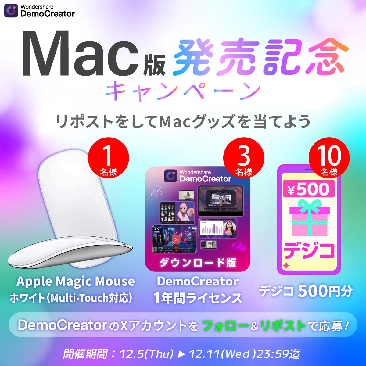 株式会社ワンダーシェアーソフトウェアが提供する画面録画・動画編集ソフト「Wondershare DemoCreator」が、待望のMac版Ver.8をリリースしました。これを記念して、特別なキャンペーンを実施中です。この機会に、動画制作をよりスムーズに進めるための強力なツールを手に入れましょう。