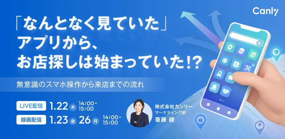 株式会社カンリーは、無料のオンラインセミナー「なんとなく見ていたアプリから、お店探しは始まっていた!?〜無意識のスマホ操作から来店までの流れ〜」を2026年1月22日、23日、26日の3日間にわたり開催します。このセミナーでは、日常的に使用するアプリがどのように店舗訪問のきっかけとなるのかを分析します。