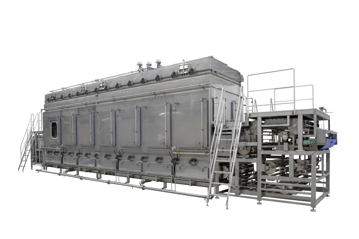 ソディックが展開する技術の中でも特に注目すべきは、連続式真空冷却装置です。このシステムは、並列に設置された2つの冷却室を活用し、交互に真空冷却を行うことで、短時間で食品を効果的に冷却することができます。この技術により、菌の増殖を抑制しながら、食味の劣化を防ぐことが可能です。個食トレーをそのまま使用し、効率的に冷却を行う点が特徴です。