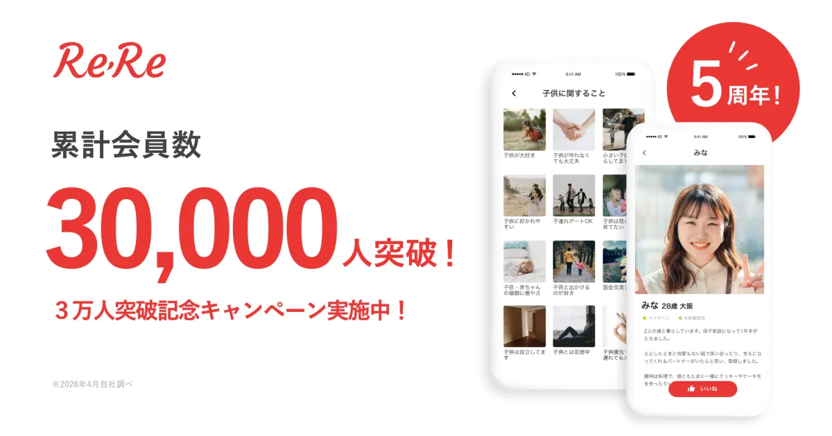 子供を持つ女性や男性に向けたマッチングアプリ「ReRe(リリー)」が、2026年4月22日(水)から5月12日(火)までの期間中、5周年および累計会員数30,000人突破を記念して特別キャンペーンを実施します。新たにアプリに登録し、有料プランを選んだ方には、アマゾンギフトカード1,000円分がプレゼントされる嬉しい特典が盛り込まれています。