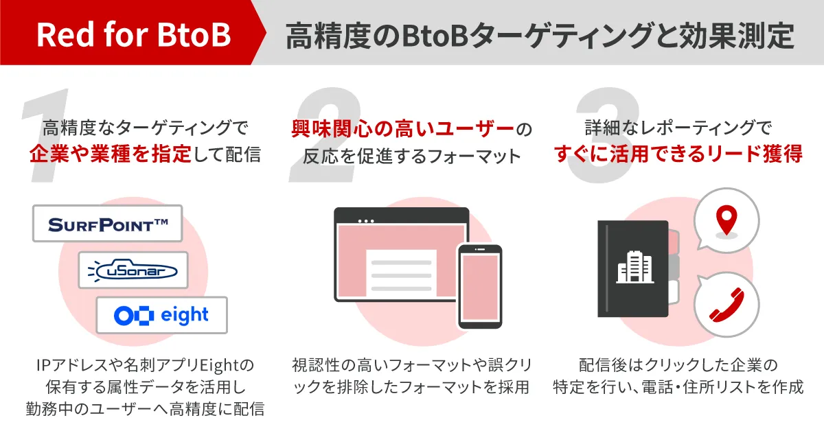 新しい「Red for BtoB」は、高精度なBtoBターゲティング、効果的な広告フォーマットでの配信、成果を可視化する詳細なレポートをワンストップで提供します。