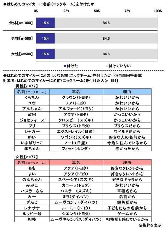 興味深いのは、初めてのマイカーにニックネームを付けたという人が15.4%もいることです。たとえば、男性からは「くらちん」や「政宗」、女性からは「もも」や「のんちゃん」といったユニークな名前が挙げられました。これには愛着を感じていることや、車に自分なりの個性を持たせたいという思いが表れています。