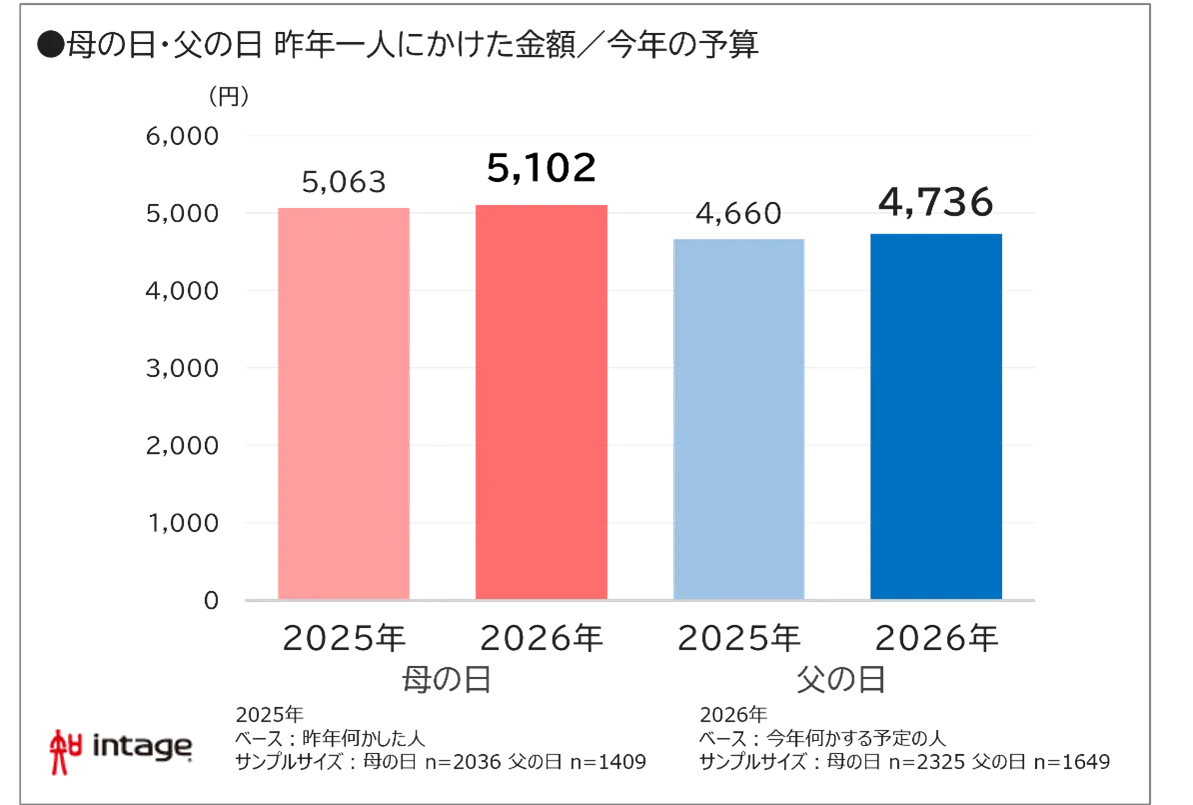調査の結果、今年の母の日の予算は平均5,102円、父の日は4,736円で、母の日が366円高いことが分かりました。昨年と比較すると、母の日では39円の増加(前年比100.8%)、父の日では76円の増加(前年比101.6%)となっています。物価が高騰している中でも、これらのイベントに関する予算は昨年水準を保っていることが興味深いと言えます。