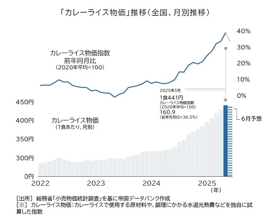2025年5月のカレーライス物価は、1食あたり441円と過去10年で最高値を記録しました。前年同月と比べると118円の上昇で、36.5%と大幅な増加率となっています。この物価は、カレーライスを調理する際に必要な原材料や調理にかかる光熱費を独自に試算したもので、消費者にとっては大きな影響を及ぼしています。