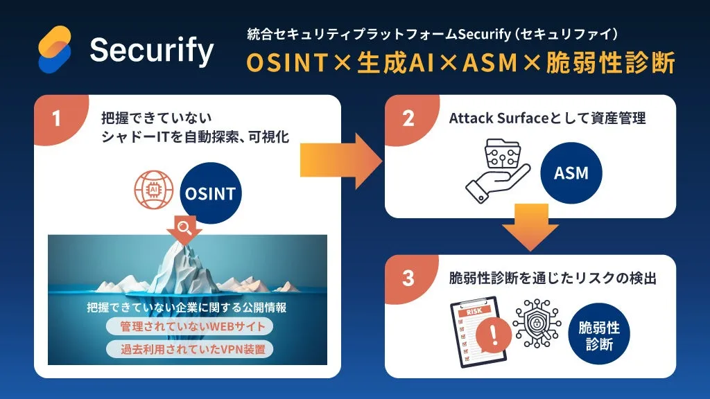 株式会社スリーシェイクが提供する、統合セキュリティプラットフォーム「Securify(セキュリファイ)」が、生成AIを活用した新たなOSINT機能をリリースしました。この機能によって、企業内でのIT資産が自動的に探索され、可視化が実現されます。また、Securifyの他の機能とも連携が可能で、より包括的なセキュリティ対策が行えるようになります。