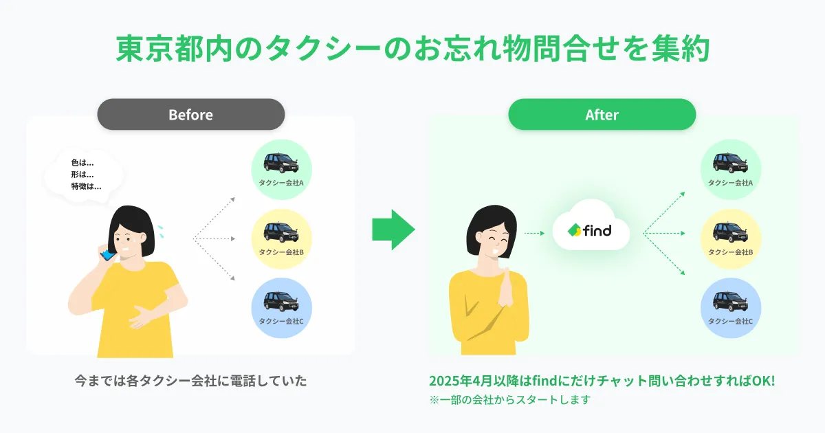 これまでは、タクシーに忘れ物をした場合、乗車したタクシー会社を特定できないため、複数のタクシー会社に問い合わせをする必要がありました。この結果、利用者は手間をかけることになり、タクシー会社には自社に届いていない忘れ物の問い合わせが多く集中するという問題がありました。これを解決するため、「落とし物クラウドfind」の導入が決定されました。
