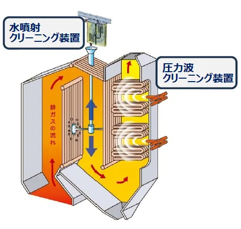 これまでのボイラークリーニング装置は蒸気を用いるスートブロワが主流でしたが、これに代わり、圧力波クリーニング装置が注目されています。この装置は発電用の蒸気を使用しないため、発電効率が維持され、ボイラーの摩耗も抑えることができるのです。