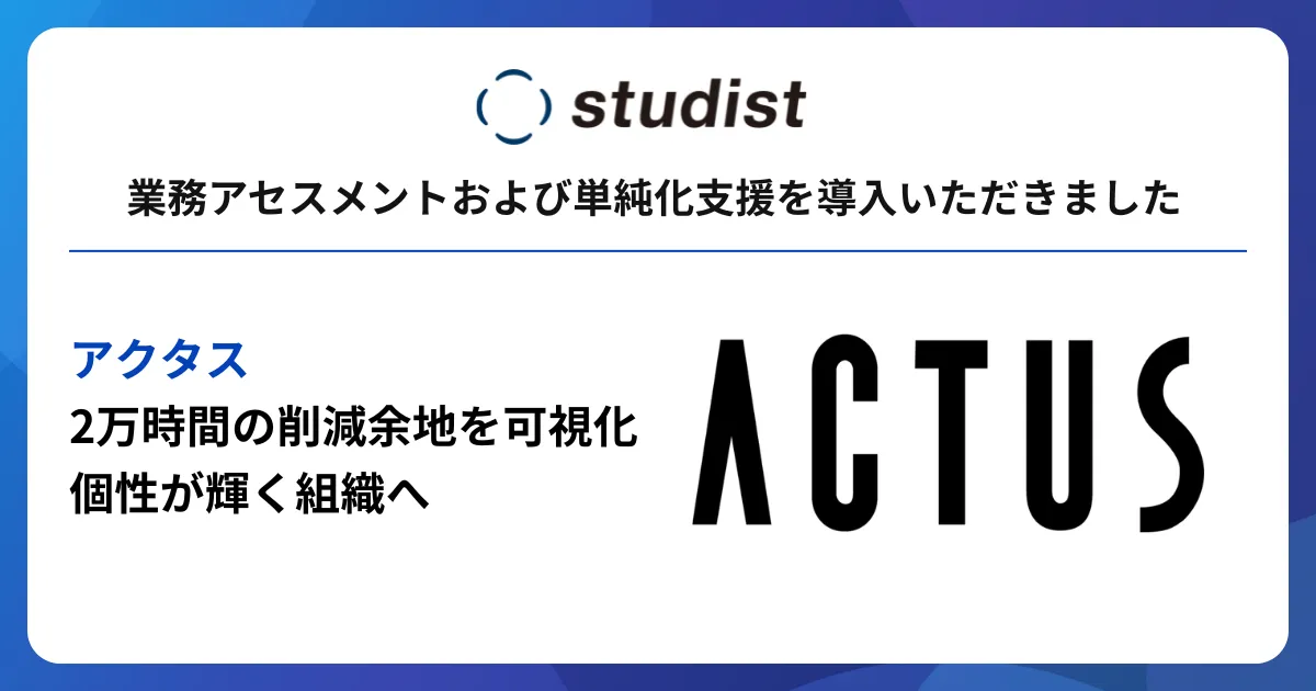 アクタスの担当者も、「仕事をスムーズに流すためのプロセスが整ったことで、クリエイティビティが解放される状況が実現した」と述べています。スタディストの支援によって、業務の実態が定量的に把握できたことは大きな成果であり、今後はこの時間の余裕を活かして、社員一人ひとりの個性が輝く職場づくりへと進めていく方針です。