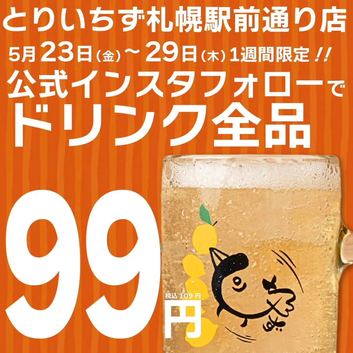 札幌駅前の「大衆とり酒場 とりいちず 札幌駅前通り店」では、特別なキャンペーンが開催中です。2025年5月23日から29日までの7日間、Instagramのフォロワーを対象に、なんと全ドリンクが1杯99円(税込109円)で楽しめるチャンスが到来しました。