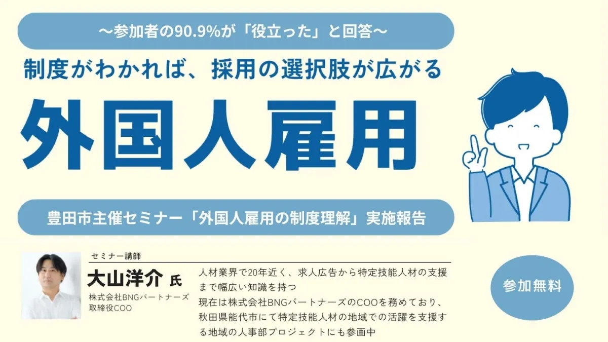 令和7年10月23日、豊田市では市内事業所の人材確保や適正な雇用の実現を目指すセミナーが開催されました。このセミナーにおいて、株式会社BNGパートナーズの取締役COO、大山洋介氏が講師として招かれ、外国人雇用に関する重要な知識を提供しました。参加者からは高い評価を得ており、90.9%が「役立った」と回答するなど、大変充実した内容であったことが伺えました。