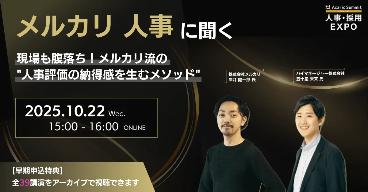 2025年10月22日(水)15時より、株式会社キュービックのグループ会社であるハイマネージャー株式会社が“メルカリ流の人事評価の納得感を生むメソッド”に関する無料オンラインセミナーを開催します。このセミナーでは、株式会社メルカリでOrganization & Talent Development Managerを務める岸井隆一郎氏がゲストスピーカーとして登壇し、実際の評価制度の運用方法や、成功・失敗から学んだリアルな事例を交えながら話します。