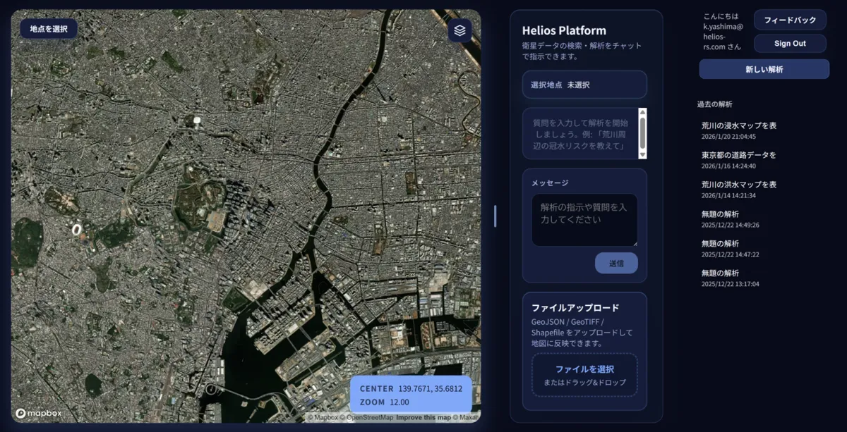 株式会社Helios(本社:東京都墨田区)は、2026年2月2日より、自然言語での対話型インターフェースを持つ地理空間解析プラットフォーム「Helios Platform」(ヘリオス・プラットフォーム)のβ版を提供開始することを発表しました。このプラットフォームは、大規模言語モデル(LLM)と独自の大規模地球モデル(LEM)を結びつけることで、専門知識がなければ扱えなかった衛星データやGISデータを、誰でも簡単に解析できるようにすることを目指しています。