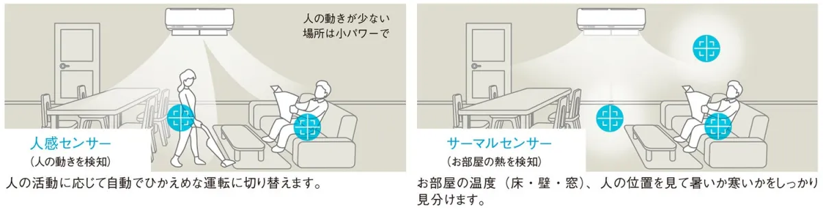 新型ビーバーエアコンは、高度な「デュアルセンサー」を搭載しています。人感センサーとサーマルセンサーが協力し、室内の温度や人の位置を感知します。これにより、AIが自動で快適な運転を行い、風向きを調整。これまでにない快適な空間を実現しています。