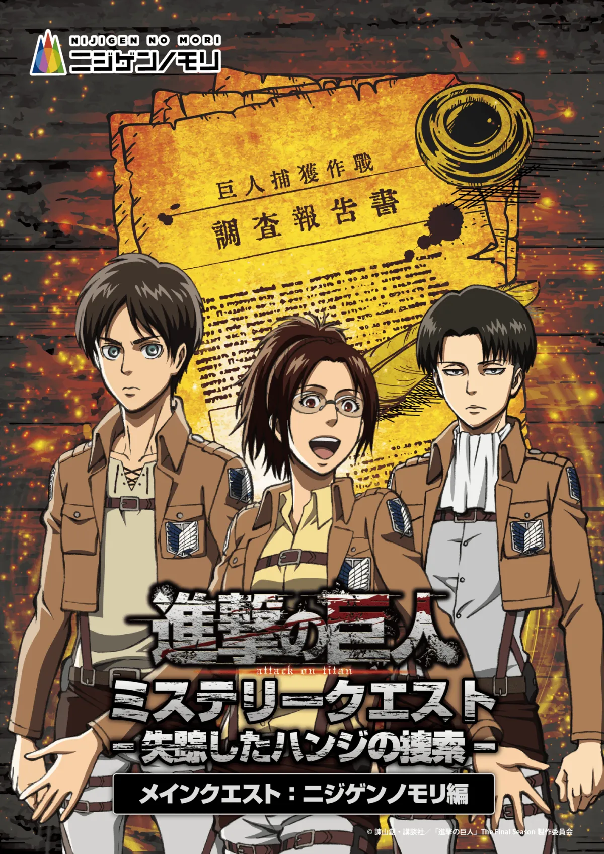 このコラボイベントは、2026年3月14日(土)から12月13日(日)までの期間限定で、実施されます。昼のイベントの第2弾として、4月25日(土)から新たに「進撃の巨人ミステリークエスト 失踪したハンジの捜索 メインクエスト:ニジゲンノモリ編」がスタートします。イベントのチケットは3月14日より販売が開始されます。