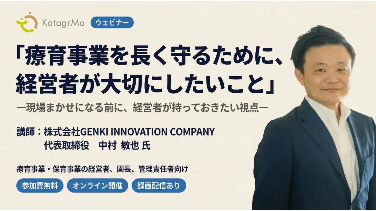 株式会社カタグルマは、2026年3月19日(木)に、放課後等デイサービスおよび児童発達支援を展開する経営層を対象とした無料ウェビナーを開催します。このセミナーでは、療育事業において経営者が重要視すべき視点に関する情報を提供します。