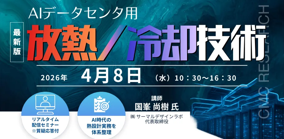 AI技術が急速に進化する現在、特にデータセンターでの電力消費問題は深刻です。そんな中、シーエムシー・リサーチが主催するセミナー「AIデータセンタ用放熱/冷却技術」が2026年4月8日に開催されます。このオンラインセミナーでは、国峯尚樹氏(㈱サーマルデザインラボ代表取締役)を講師に迎え、最新の冷却技術の実務的な視点からの解説が展開されます。