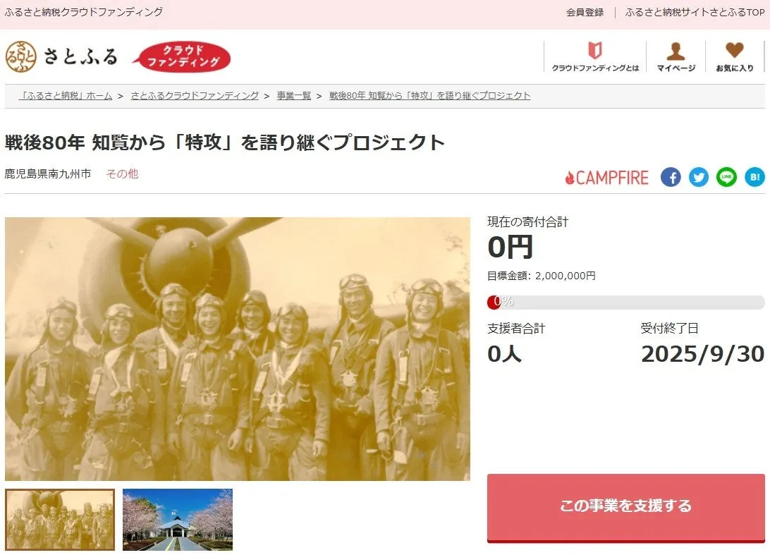 また、ソーシャルファンディングプラットフォームである株式会社CAMPFIREとの提携によって、参加者は広範な選択肢から自身の価値観に合った寄付先を見出すことが可能です。 特攻の歴史を聞き、感じ、次世代に繋いでいくために、このプロジェクトへの参加と支援を心よりお願い申し上げます。
