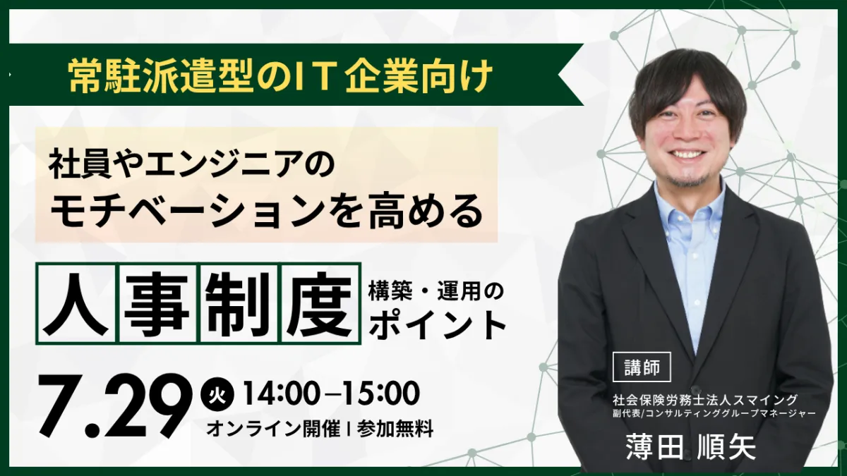 このセミナーでは、昨今特に問題視されている優秀なエンジニアの離職や、社員のモチベーション低下、法改正に対する対応について取り上げます。エンジニアが顧客先で働く常駐派遣やSES(システムエンジニアリングサービス)事業を行っている企業は、特有の課題に直面することが多くあります。それだけに、適正な評価制度や給与制度の構築が急務です。