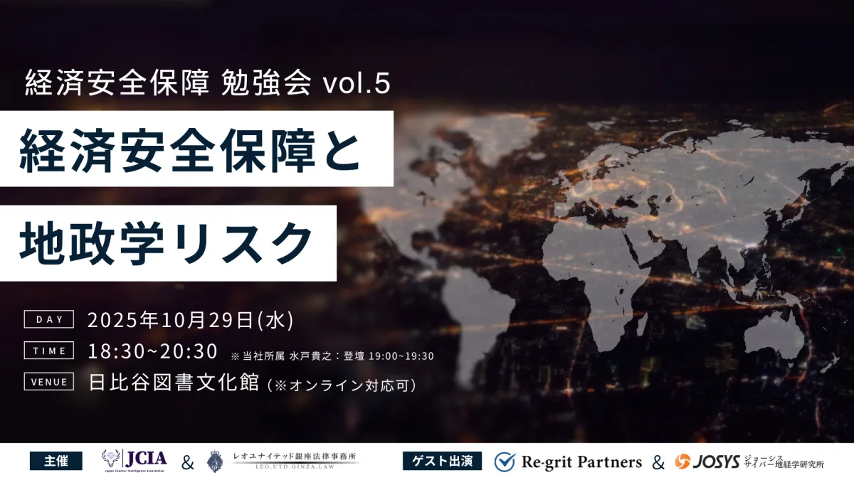 株式会社Re-grit Partnersが主催する特別勉強会が2025年10月29日(水)に開催されます。今回のテーマは「経済安全保障と地政学リスク」。この勉強会では、経済環境の変化と地政学的要因が企業に与える影響について、専門家の知見から学ぶことができます。