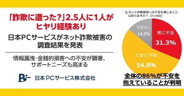 デジタル機器の設定やトラブル解決を行う日本PCサービス株式会社は、2025年4月に実施したネット詐欺や置き配盗難に関する調査結果を発表しました。この結果、インターネットを利用する人の約86.1%がネット詐欺に対する不安を抱えていることが明らかになりました。さらに、2.5人に1人が実際に詐欺被害に遭った経験があることがわかり、特に情報漏洩や金銭的損害が懸念されていることが浮き彫りとなりました。